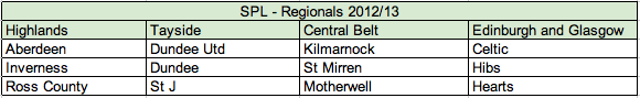 Take the current twelve SPL clubs and split them into 4 regional groups of 3 teams, as follows, operating on the current system, with the end-of-season sprint-finish “split”:
